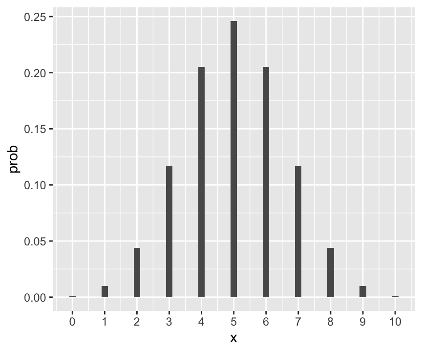 Probability mass function \[p(x) = P(X=x) = {n \choose x}p^x (1-p)^{n-x}, x=0, 1, 2, \ldots\]