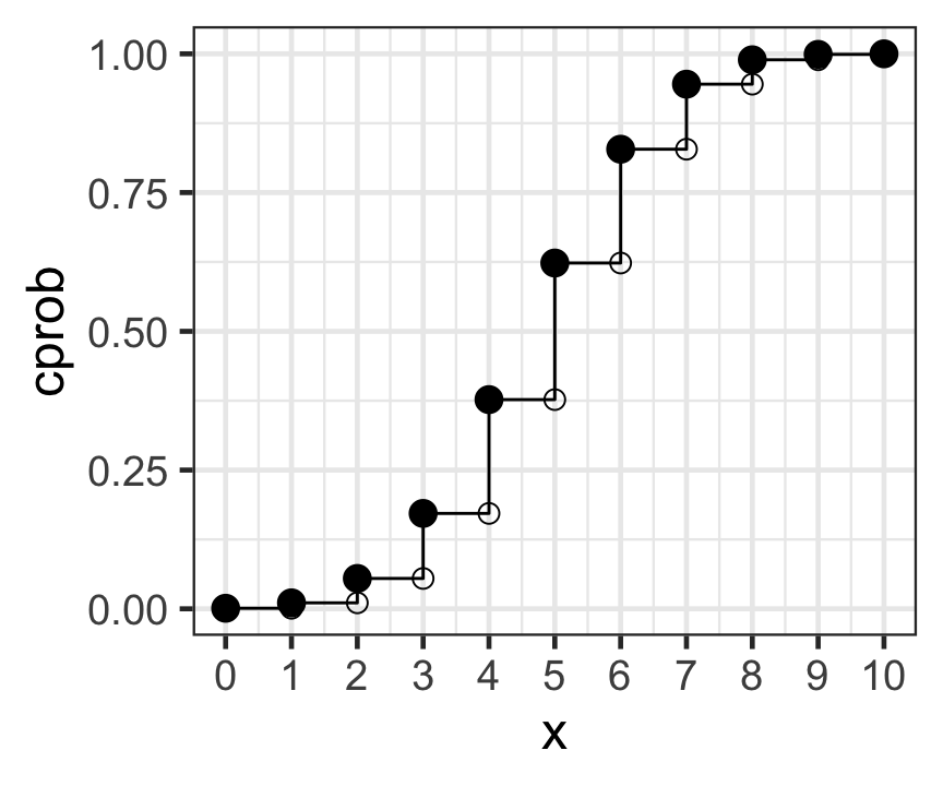 Cumulative distribution function \[F(x) = P(X\leq x) = \sum_{y = 0}^x P(X=y)\]