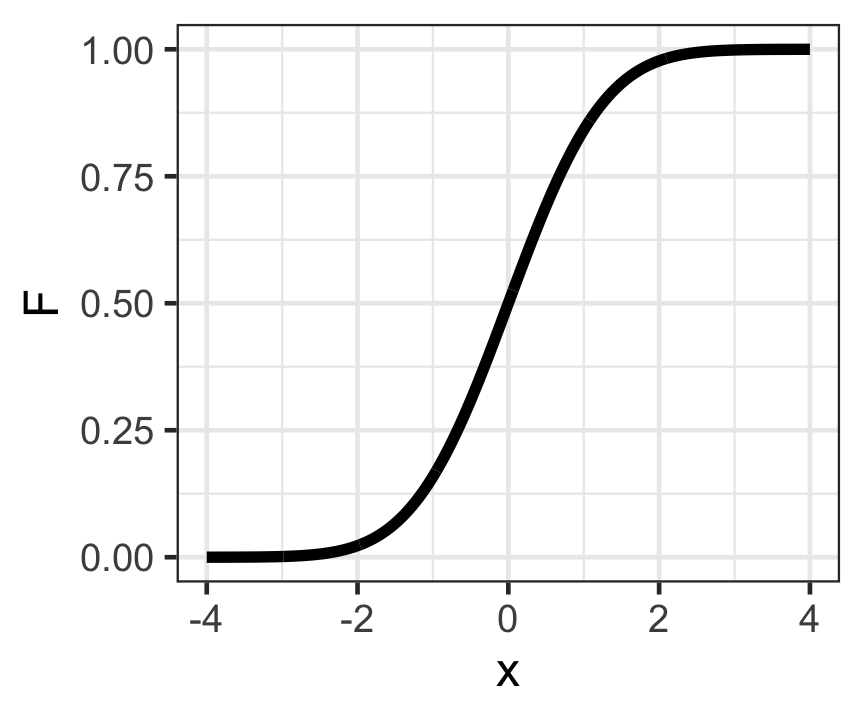 Cumulative distribution function of standard normal distribution \[\begin{aligned}P(Z\leq z) &= \int_{-\infty}^z \frac{1}{\sqrt{2\pi}}\,e^{-(x^2/2)}dx\\ & = \Phi(z)\end{aligned}\]
